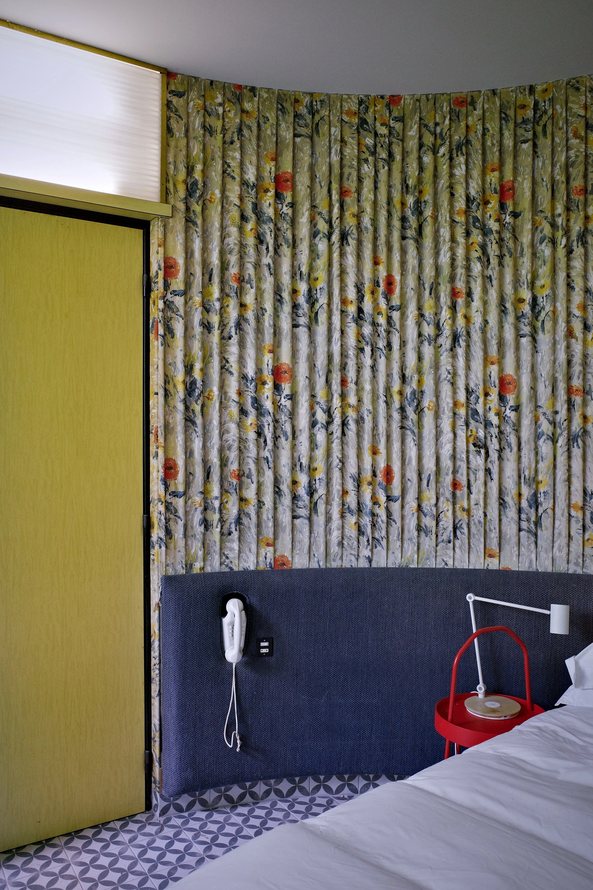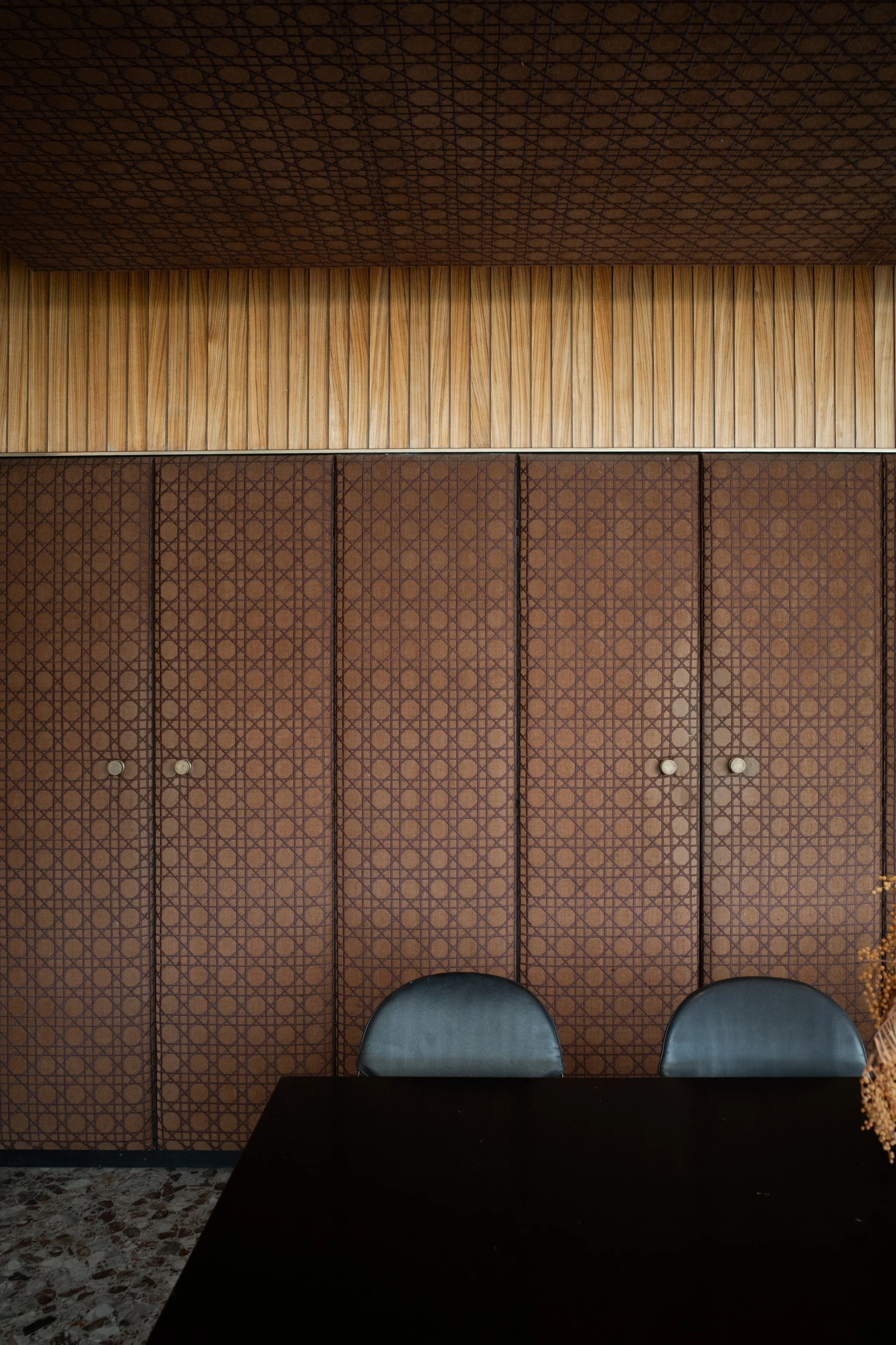 La salle à manger prolonge cette expérience sensorielle : un plafond tendu de motifs, de longs placards tapissés, un balcon suspendu en mosaïque bleu turquoise, écho chromatique à l’entrée. L’ensemble évoque les intérieurs feutrés des années 50, avec cette capacité rare à conjuguer exubérance et précision.