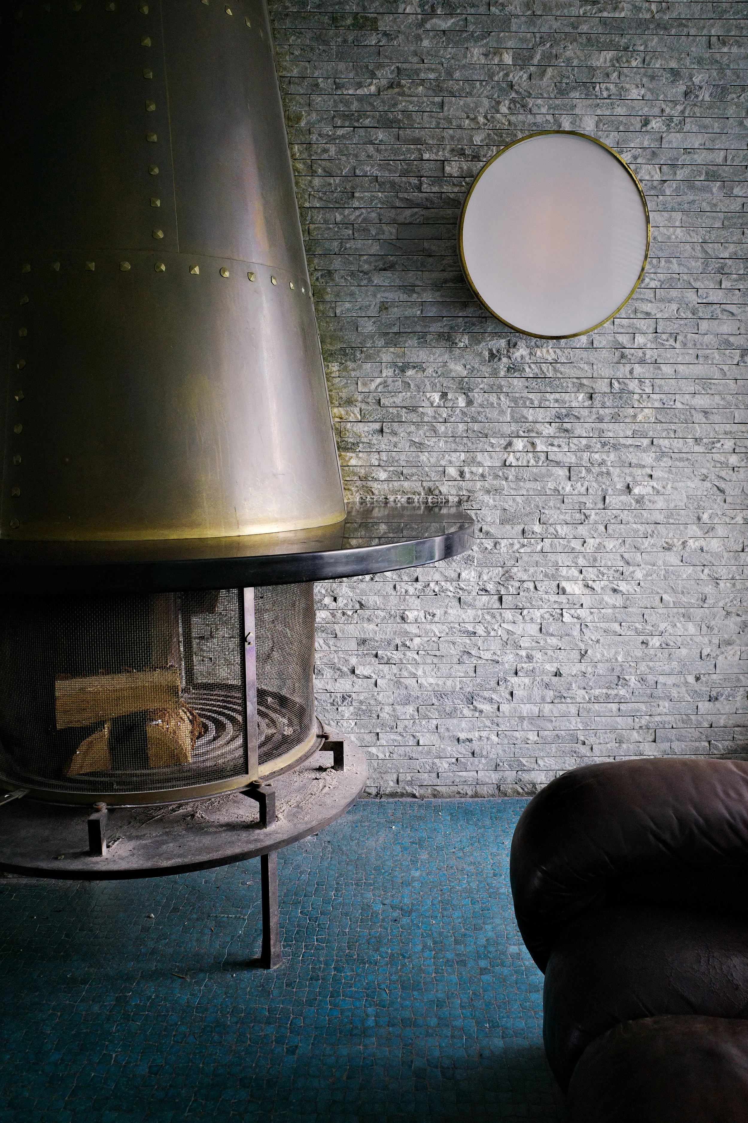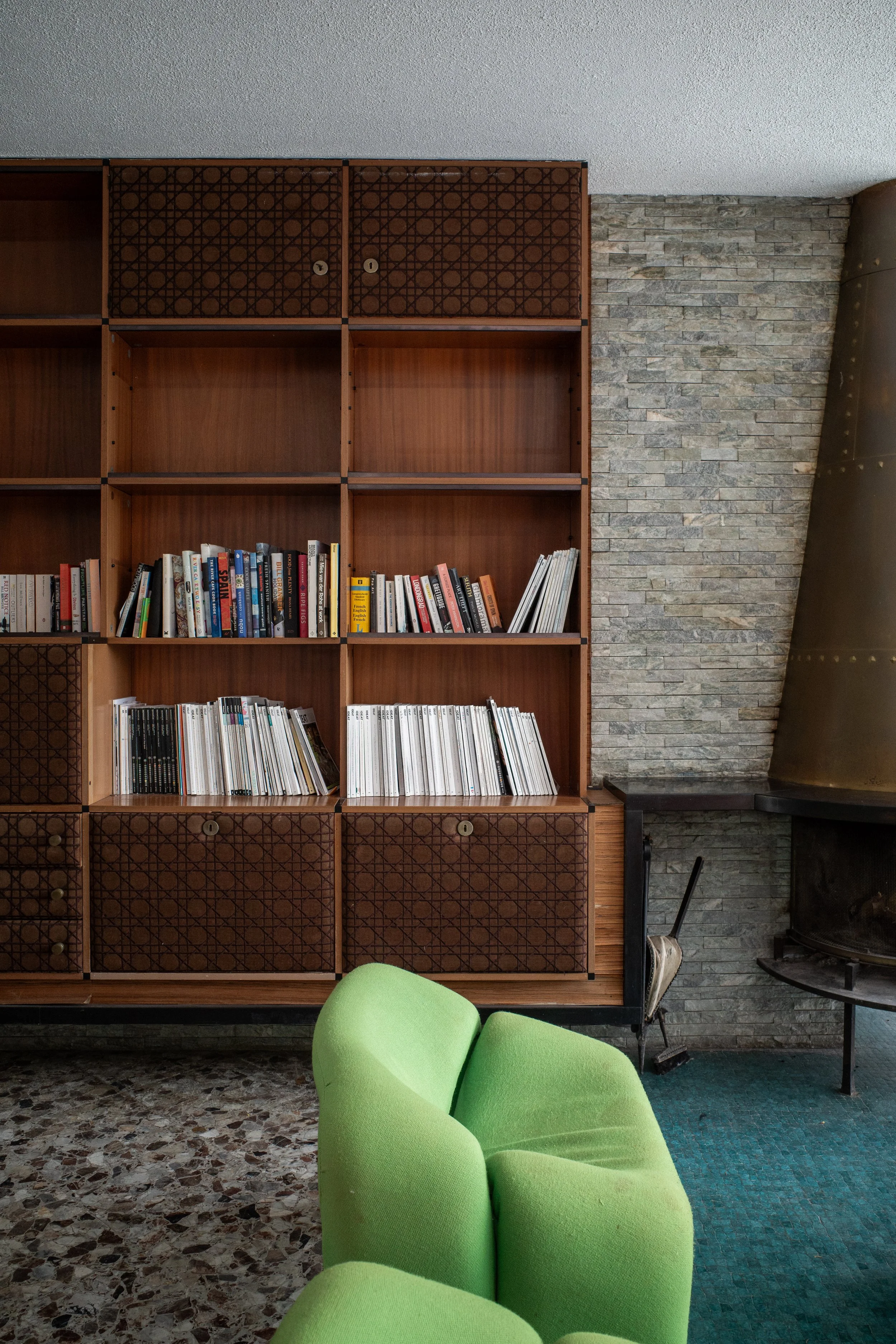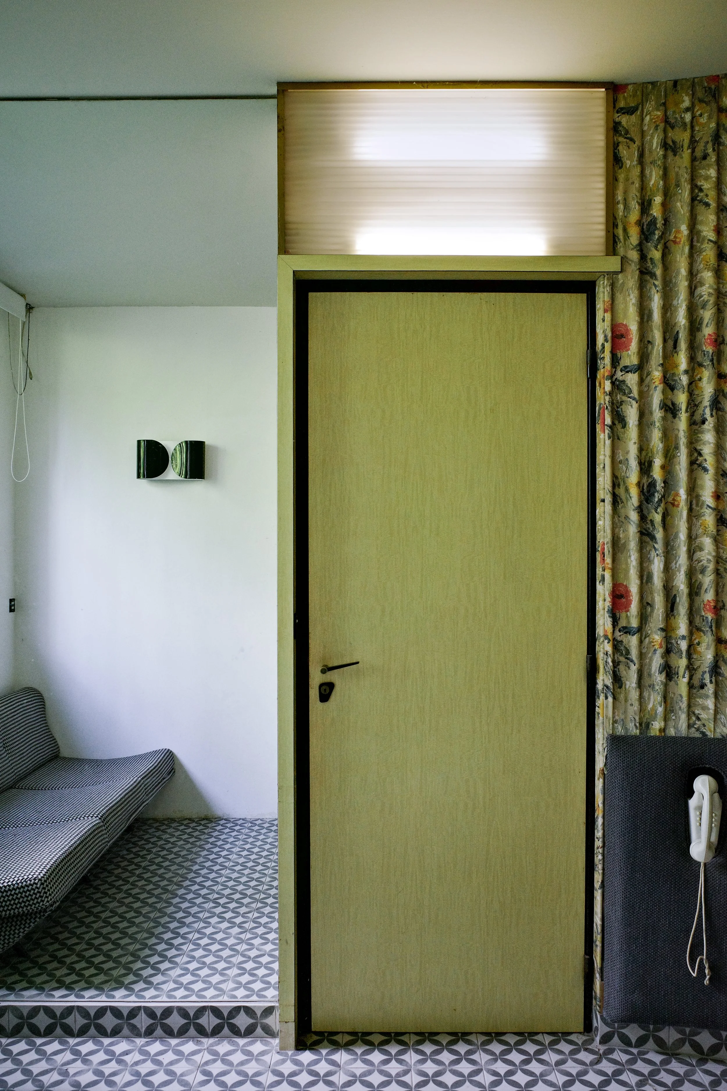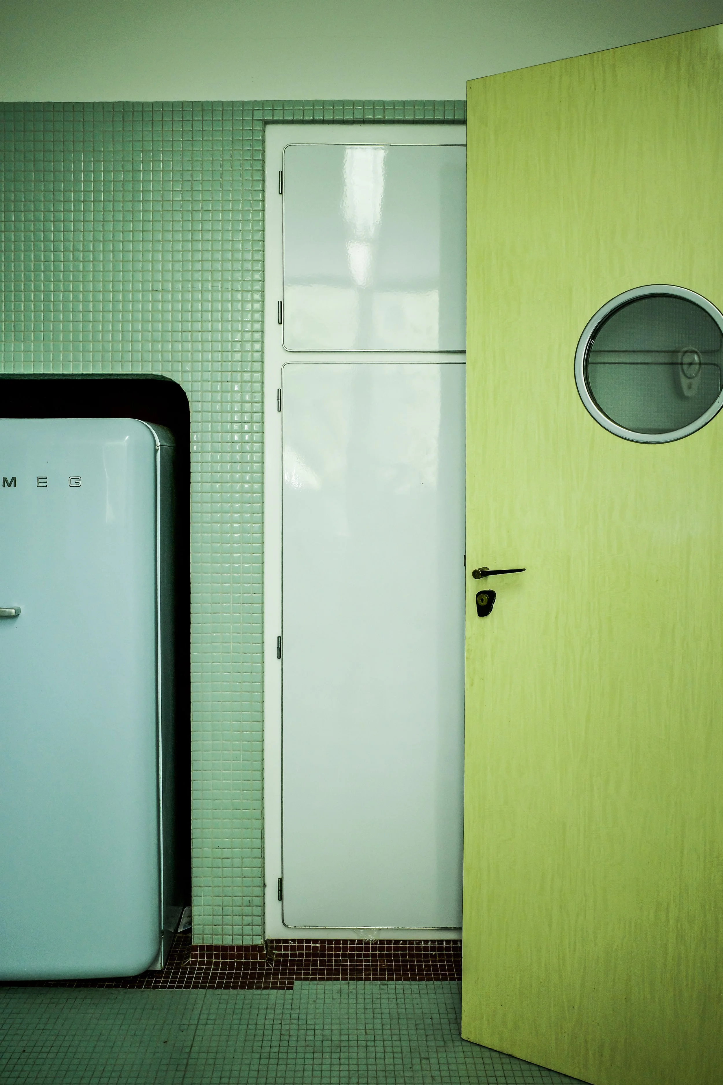 Une porte presque invisible s’ouvre sur un bar en Formica, ses bouteilles encore recouvertes de poussière ; l’antichambre parfaite avant de pénétrer la cuisine, elle aussi en Formica bleu, sur fond de mosaïque soulignée d’un liseré rouge. Le sol devient tableau. Le temps s’arrête.