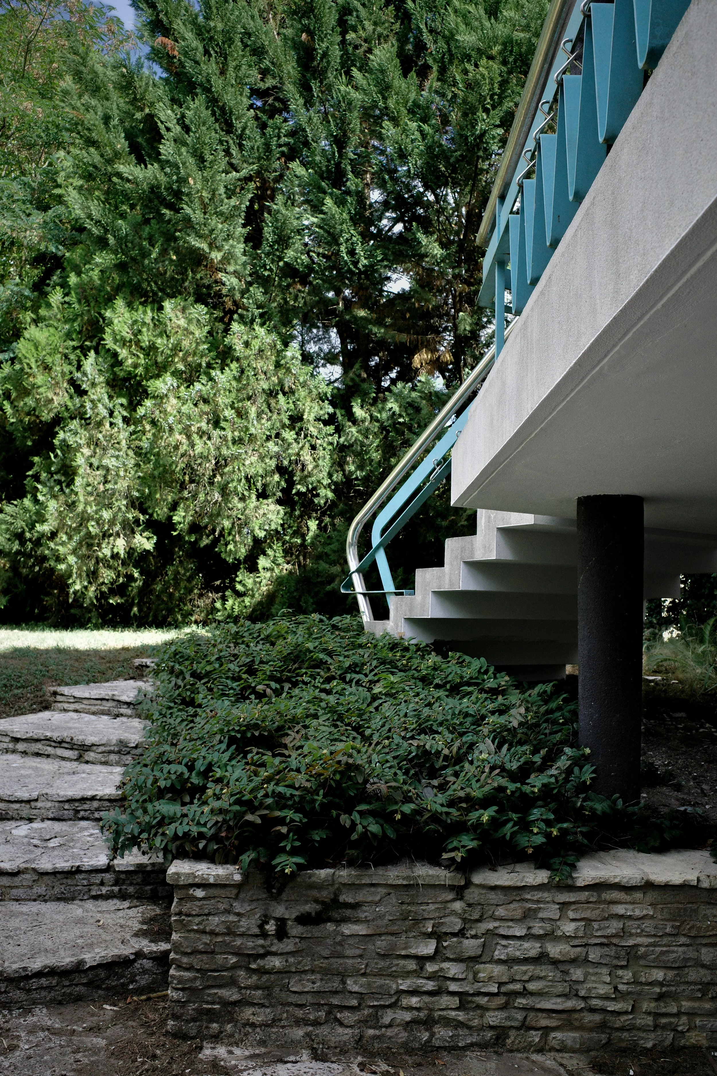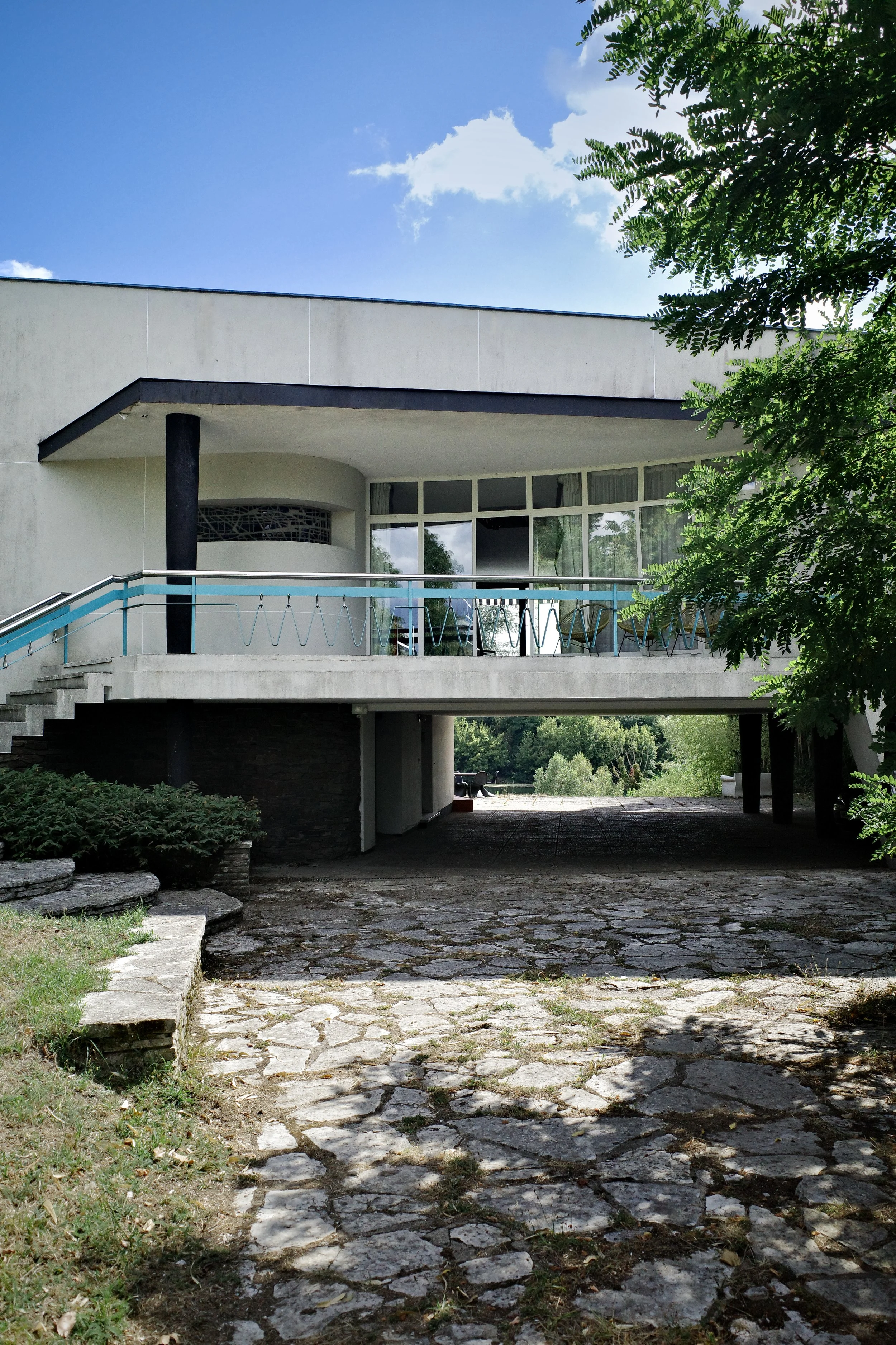 Un vitrail éclatant capte la lumière, un garde-corps bleu magenta dialogue avec les feuillages alentour, les poteaux se fondent dans l’ombre. On avance, intrigué, happé par une large ouverture vitrée qui s’étire au premier étage : la maison s’ouvre à nous.