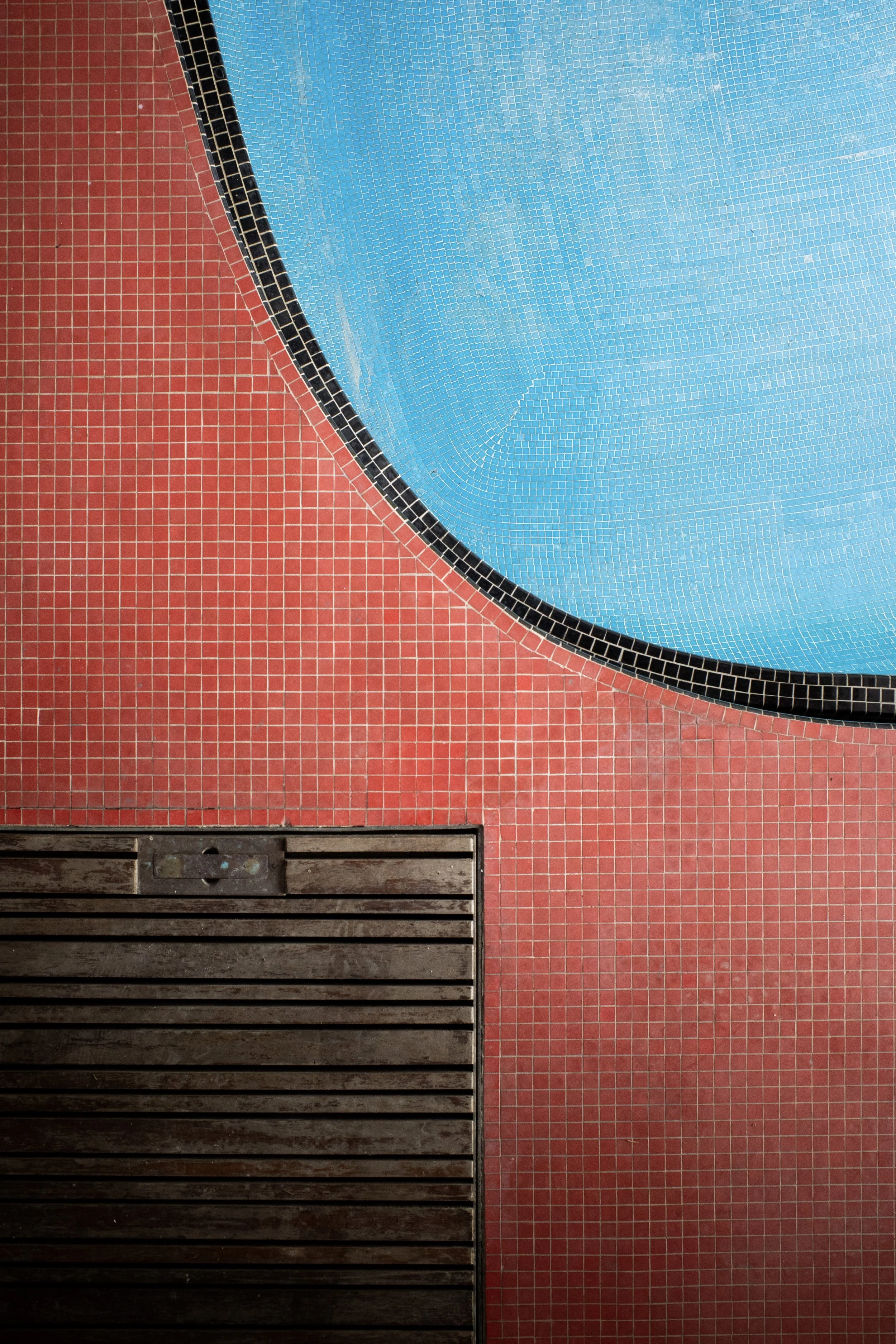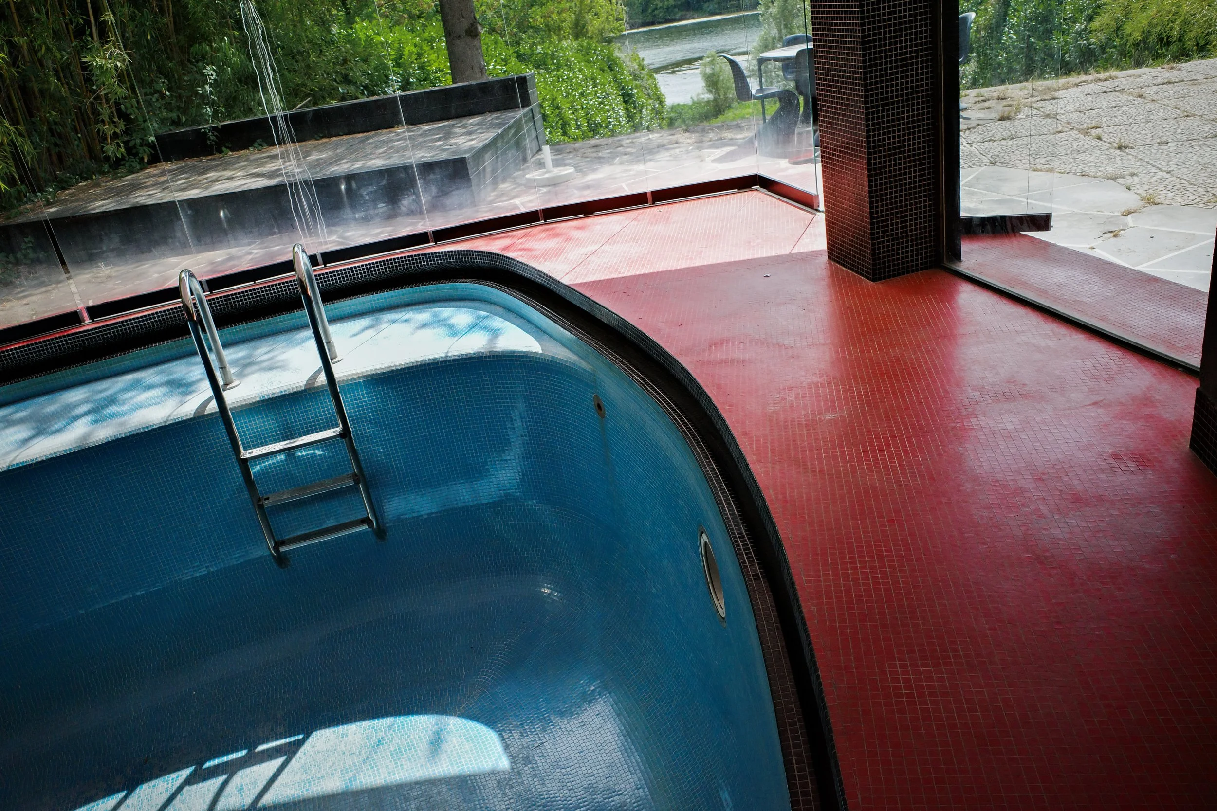 Et puis, la surprise finale : une pièce vitrée, sans montants, ouvert sur la verdure, abrite une piscine à la forme libre, tapissée de mosaïques bleues, rouges, noires. Une fresque de huit mètres orne le mur, écho aux géométries intérieures. Ici, le geste architectural devient presque pictural. On pense à Gaudí, à Sottsass, à un modernisme joyeux et débridé. On rêve de s’y plonger.