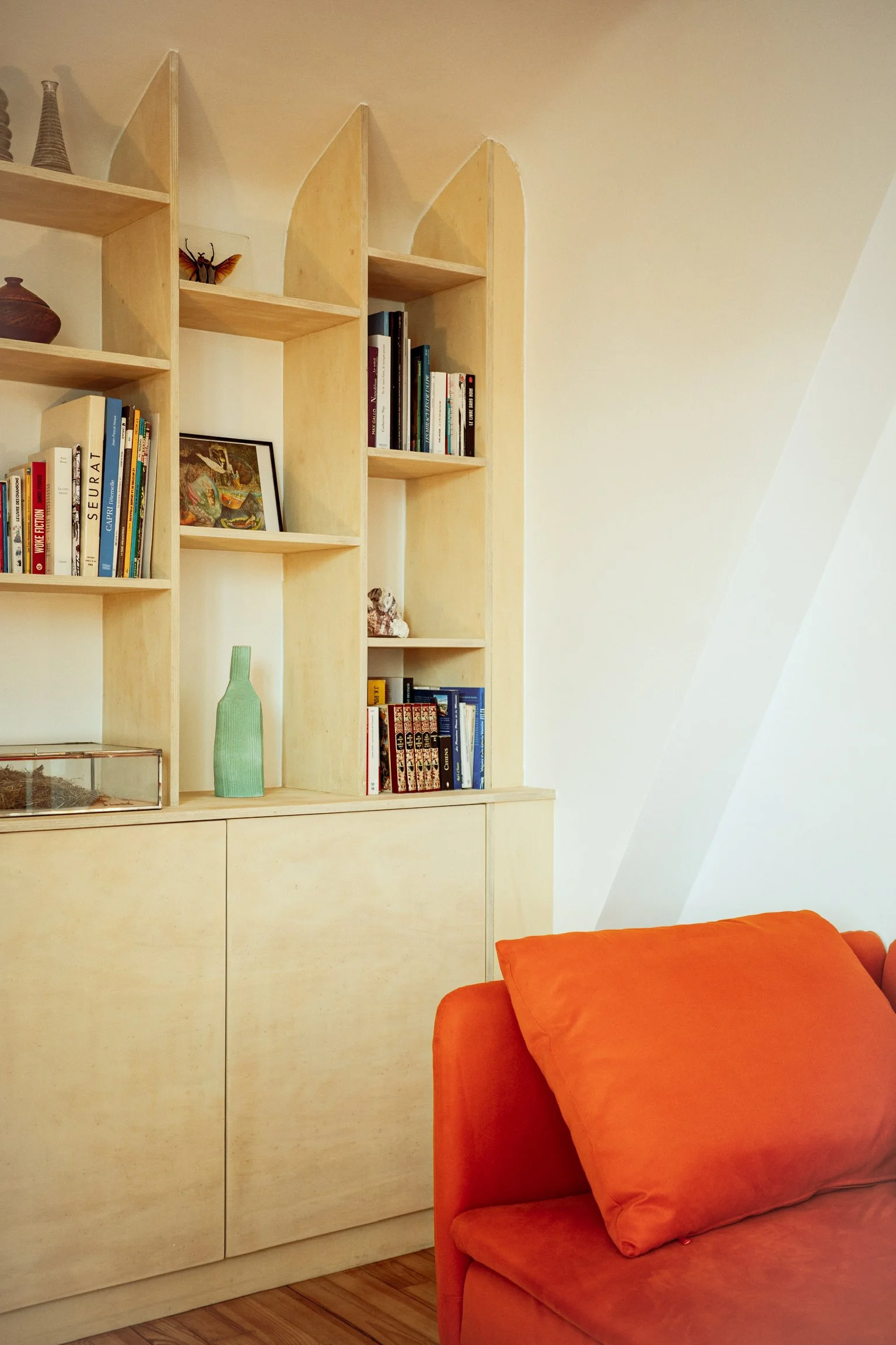 La dépose de certaines cloisons a révélé des poutres structurelles que nous avons choisi de conserver, afin de mettre en valeur la structure originelle.