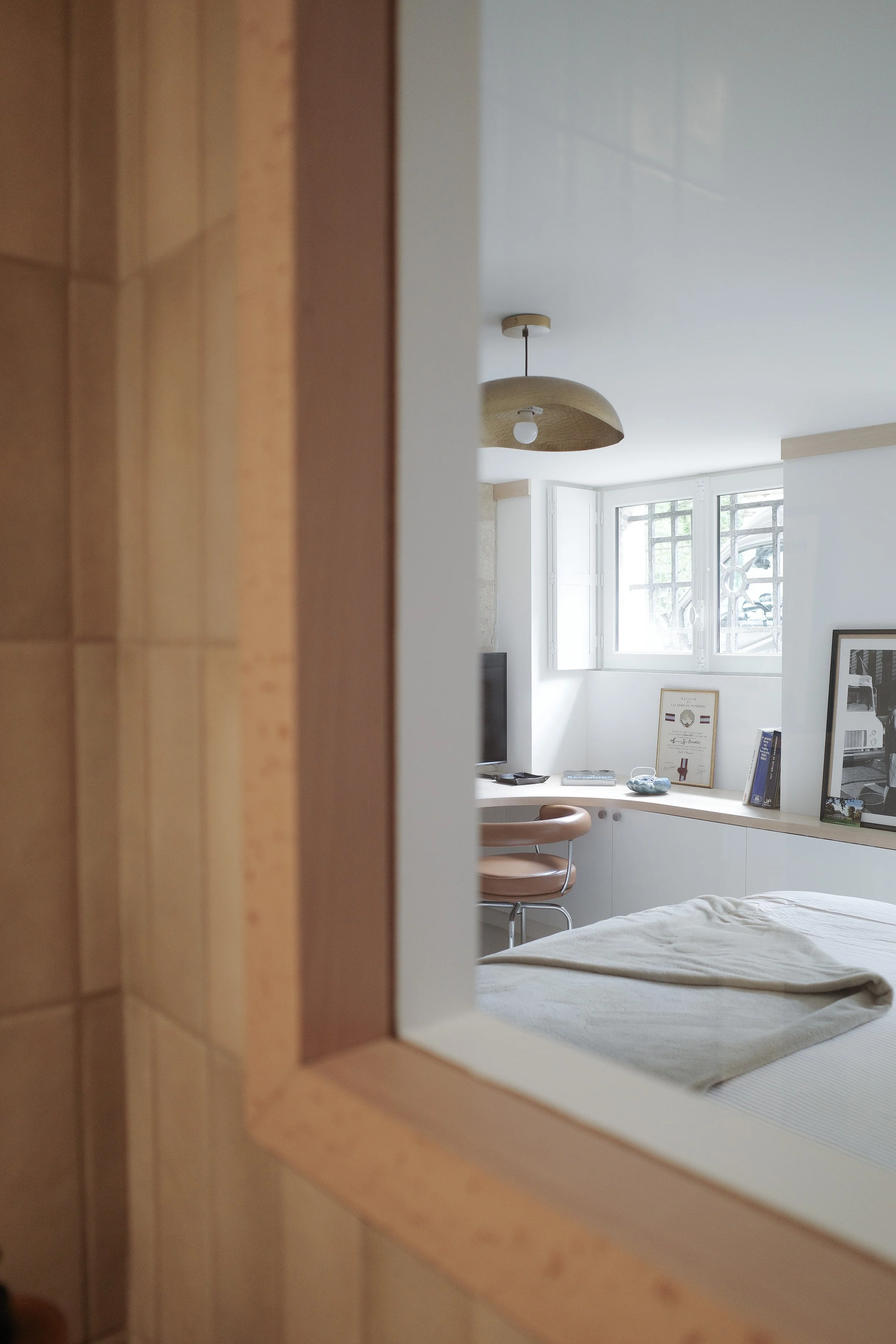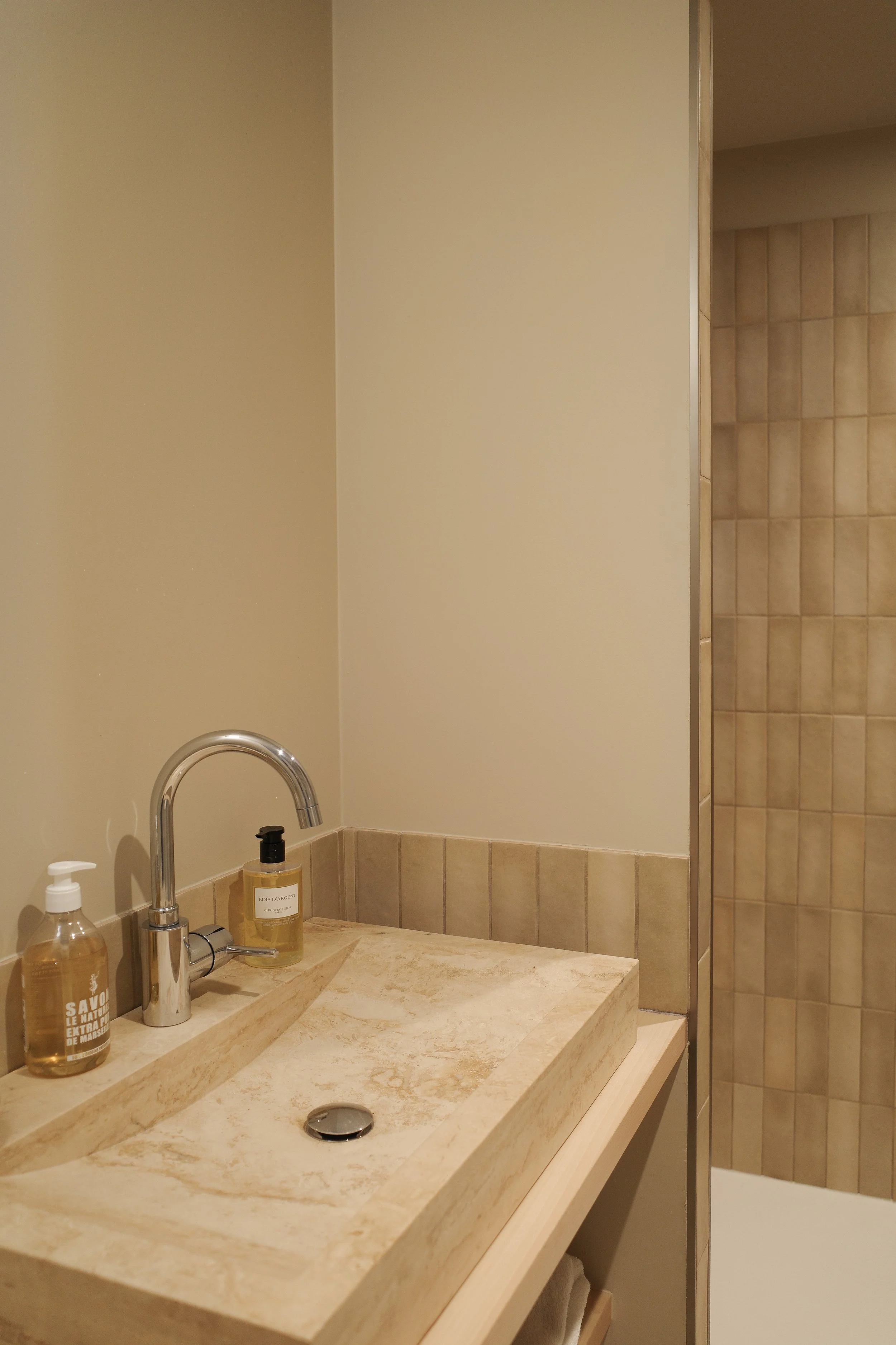 Un jeu de cimaises en bois unifie l’ensemble, tandis que la salle de bain, en monochrome, évoque la pierre naturelle bordelaise, mettant en valeur le mur en pierre conservé.