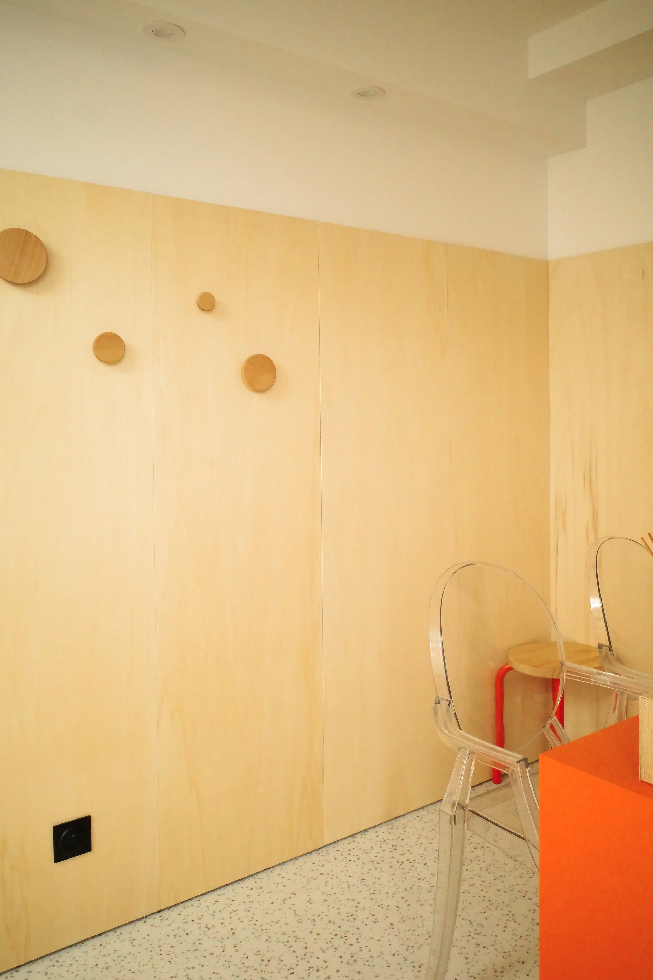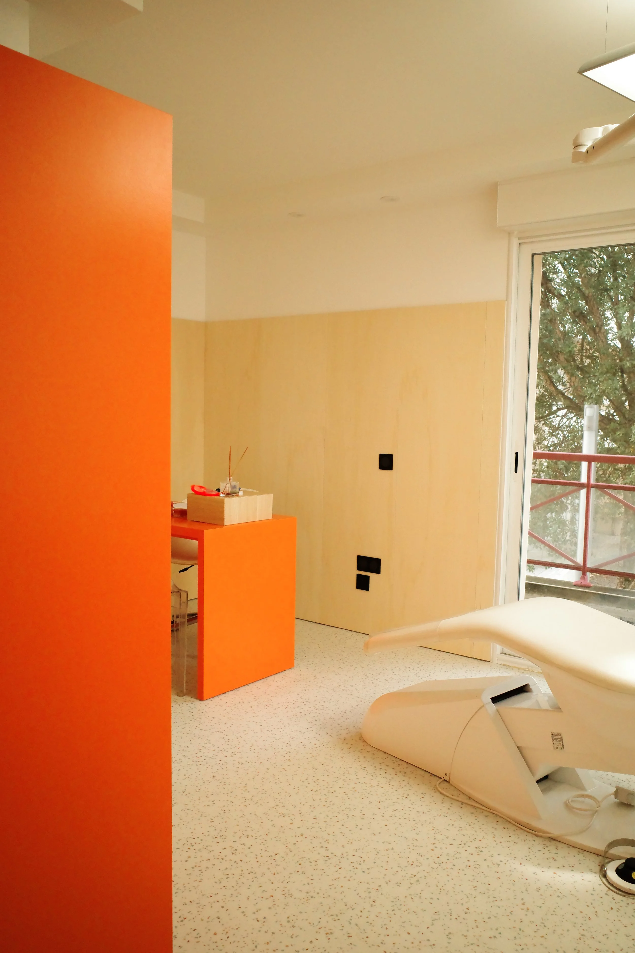 Le peuplier, choisi pour sa teinte claire, apporte chaleur et luminosité dans un environnement souvent perçu comme stérile. Un orange vif vient lier les différentes parties du cabinet, créant une cohérence visuelle.