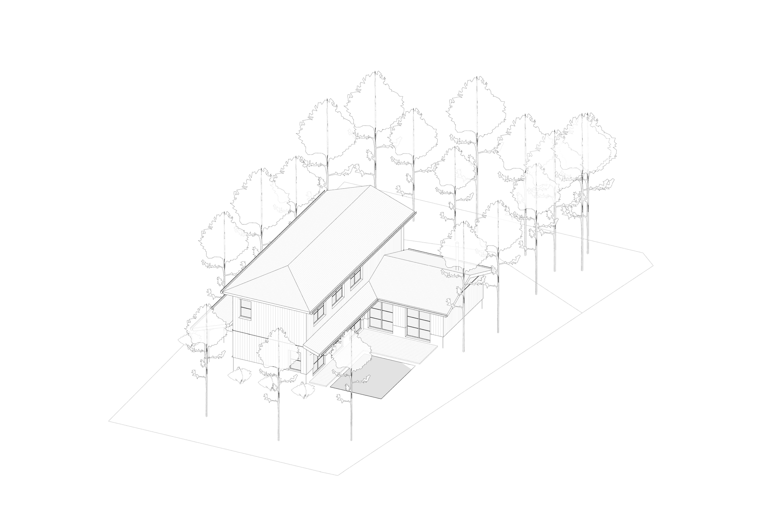 Le projet exploite la profondeur du terrain, avec une légère pente vers l’entrée. Les espaces de vie sont orientés vers la forêt de pins, et le volume principal réinterprète la longère landaise traditionnelle dans une forme plus contemporaine, attentive aux orientations solaires et aux vues.