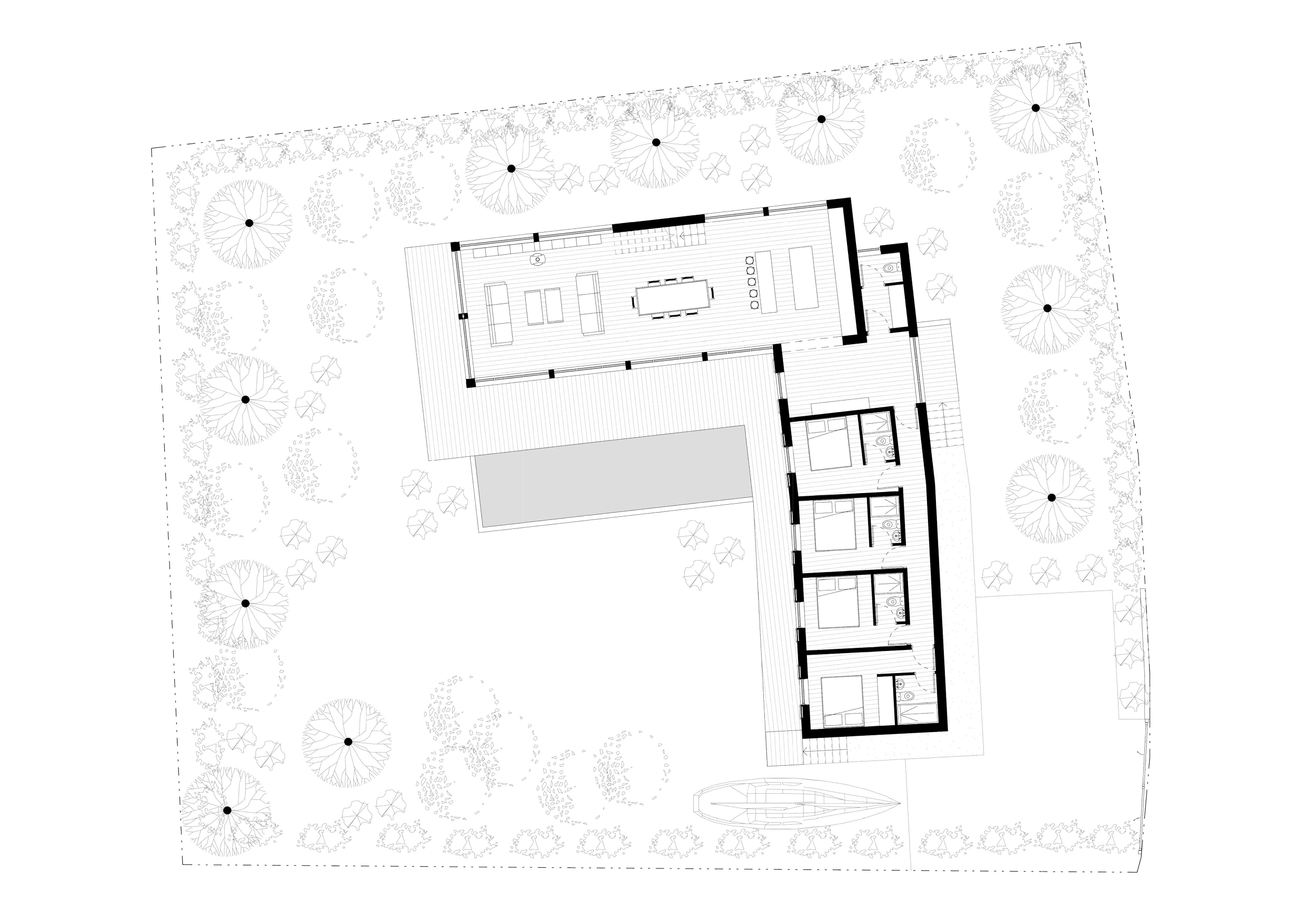Organisée en L autour d’une terrasse centrale, elle distingue espaces de vie et espaces de nuit, et s’ouvre généreusement au Sud-Ouest pour capter la lumière tout au long de la journée.
